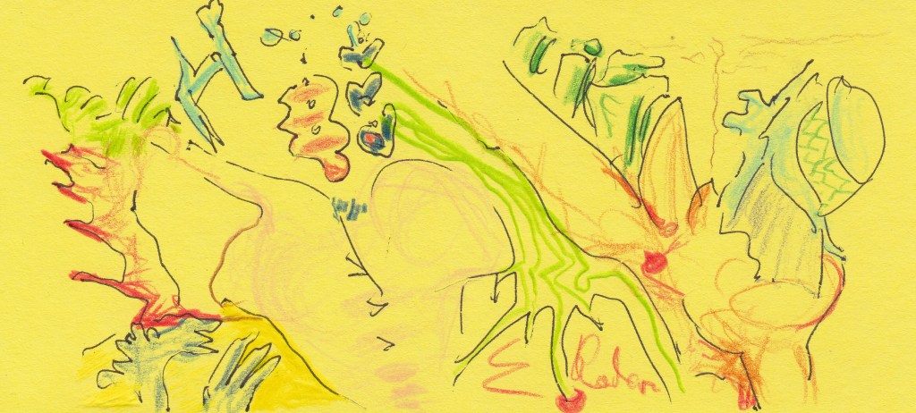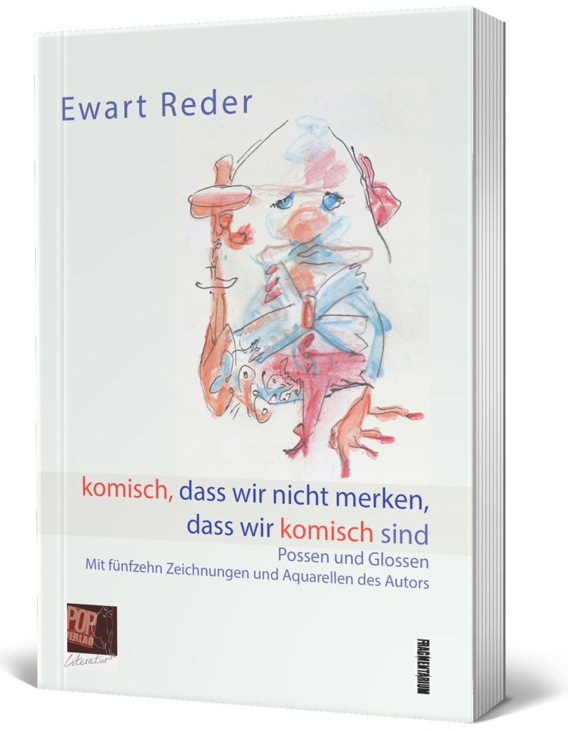 Da isses, mein neues Buch! Zur Leipziger Buchmesse 2025 stellt es sich vor. Es heißt komisch, dass wir nicht merken, dass wir komisch sind. Possen und Glossen. Drin stehen Kolumnen aus den letzten Jahren und Satiren, die sich seit meinem letzten Erzählband angesammelt haben. Eine leichte Tonlage bei zum Teil ernsten Themen, ein freundlicher Blick auf Wetterereignisse von unterschiedlicher Freundlichkeit, verspielte Schreibansätze und schräge Perspektiven dürfen erwartet werden. Fünfzehn Zeichnungen und Aquarelle von mir hübschen auf. Liebe Leserin, lieber Leser, stoß an mit mir auf eine hinreichend anstößige, minimal verbindliche Neuerscheinung, von deren Cover mein aqua ego mit dir anstößt!